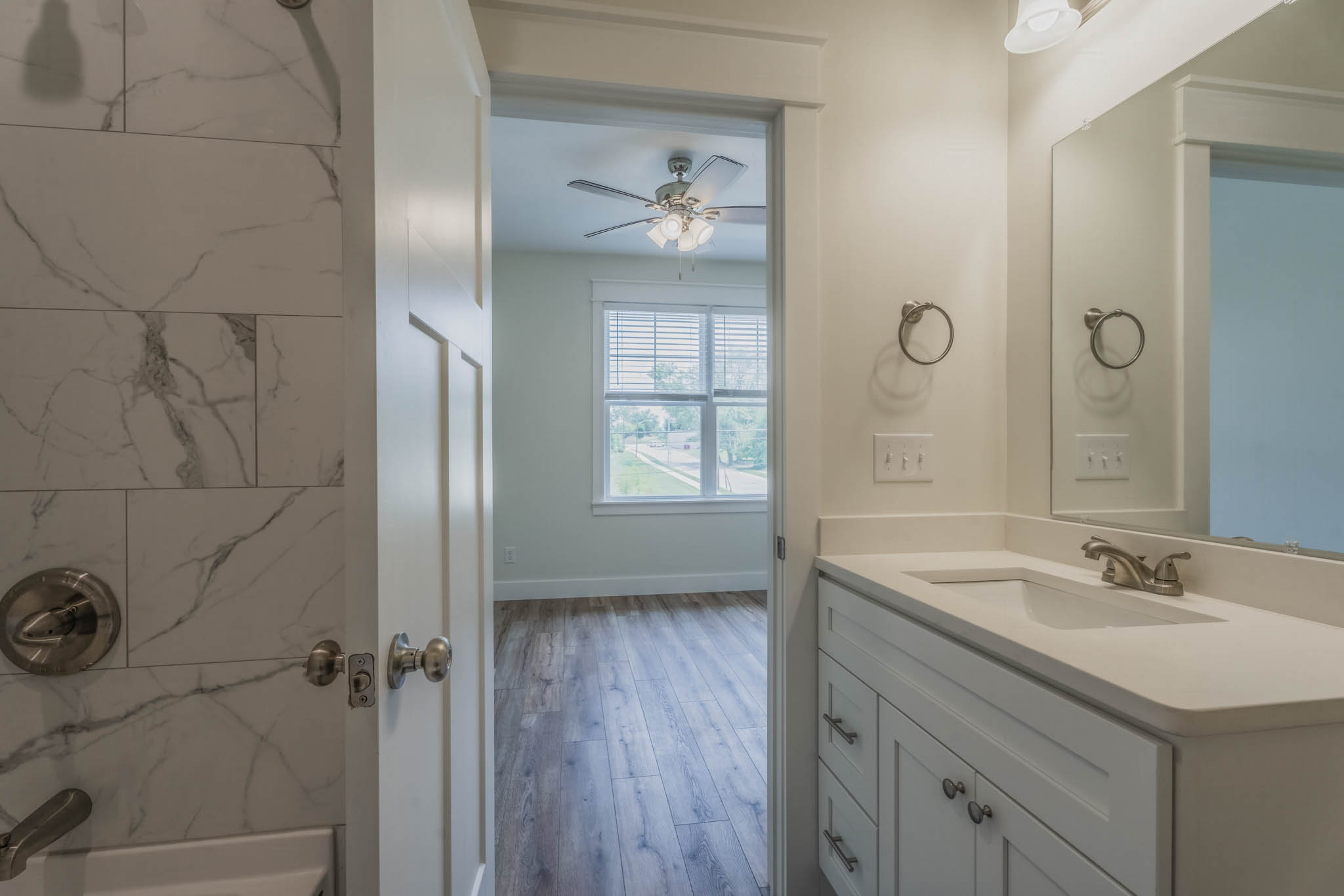 High-end finishes include vinyl plank flooring throughout, quartz counter tops and stainless steel appliances, washer/dryer in unit, walk-in pantry, covered front porch